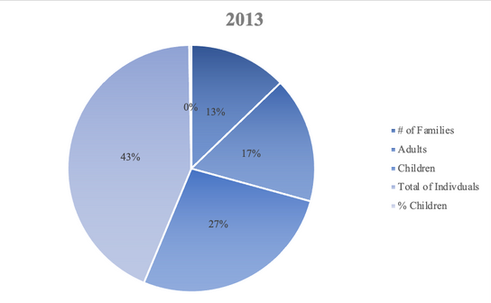 The following are our calculations from 2004-2024, including the number of families, adults, children, total of individuals, and percentage of children served.